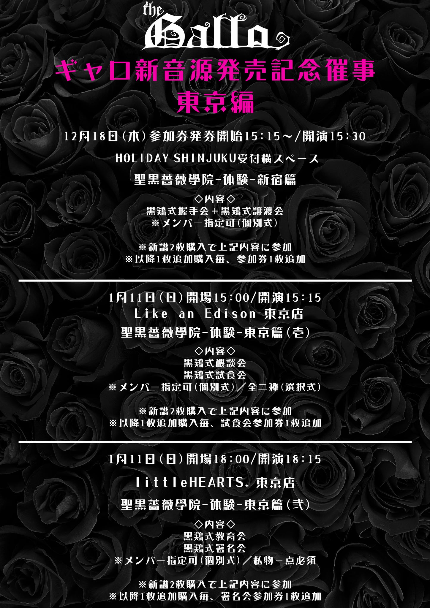 参加方法:Like an Edison東京本店で11月4日(火)発売、ギャロ「聖黒薔薇學院-青春-」(税込\1,700)をご購入の方にイベント参加券を配布致します。